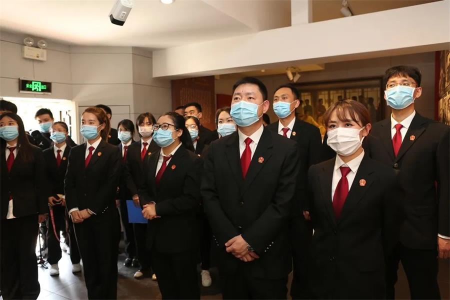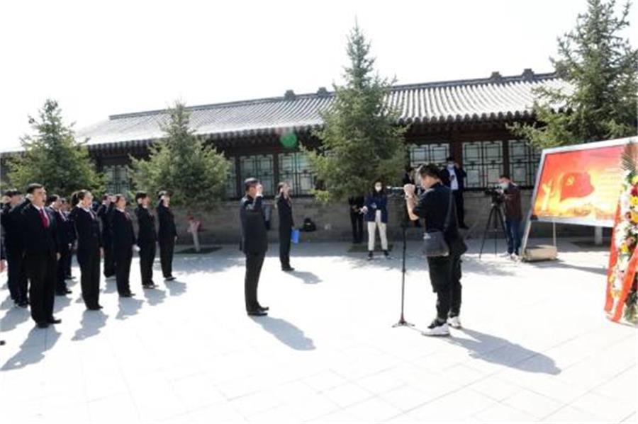 春日的乌兰夫故居阳光明媚,庄严肃穆,参加活动的干警怀着无限崇敬和怀念,在乌兰夫故居院内前整齐列队,向乌兰夫铜像敬献花篮。杨宗仁院长整理花篮缎带,全体干警面向铜像鞠躬致意,深切缅怀乌兰夫同志的丰功伟绩,寄托对先烈的无限哀思。全体党员面向党旗,在杨宗仁院长的带领下重温入党誓词。